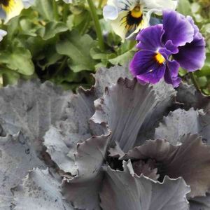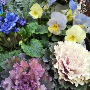 🏷青い寄せ植えマニア 🏷水曜日は水色 日曜日に今年最後の寄せ植えを作りました😊💜🌿 ちりめん葉牡丹、ミニ葉牡丹、バラ咲きジュリアンいちごのミルフィーユ、紺色のジュリアンです💐💙 お正月らしいシックなお花で纏めてみました😂🎍