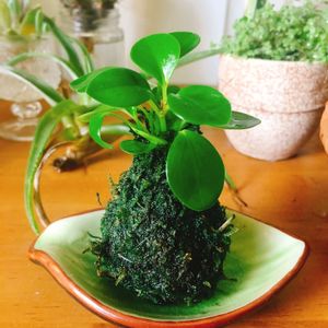 スリコの苔玉、ソーキングのタイミングがいいのかやたら元気。 たぶんペペロミアだと思ってるけど自信なし。