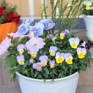 🍀寄せ植えをリメイク🍀 連投失礼します(・o・;) 以前作ったルピナスの寄せ植え ですが、お花が終わってしまったので、ロスフラワー市で購入したパンジー、ペチュニア、ゴールデンクラッカーを足してリメイクしました(◍•ᴗ•◍)✧*。🩷🩵💛