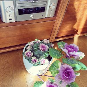 三年ものの3連葉牡丹に 今季のミニ葉牡丹、ミニミニ葉牡丹を寄せ植えにしました☺️