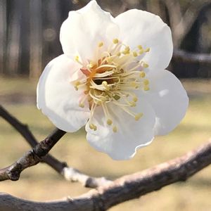 夕暮れ時、真っ白なウメのお花「初雁」をパチリ!📸🌼😊😄🌇👌 雁でなく、小鳥が来ました。🦜✌️ 今日も調いました。♨️🧖♂️🍺🥃🌸