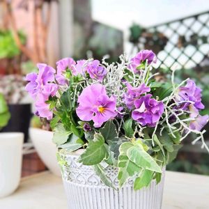 寄せ植え3つ目🌼*・ フリルがかわいいビオラとアリッサム、シルバータイム、カレックスで。 鉢の正面気にしながら植えたはずなのにズレてる笑 修行が必要だ~😂 今年も今日で終わり。 来年もたくさんのお花や緑に囲まれて癒されながら過ごしたいな💚🍃
