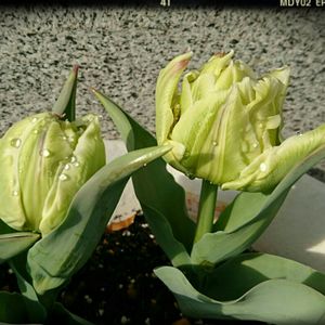 チューリップ ベロナ 八重咲きでゴージャス✨꧂ 直径13cm! ちょっと見えないですけど、外側にグリーンのストライプが入るさわやかさんです(爽´ω`爽) 一緒にいるパンジー、薄〜い水色で中央がクリームイエロー💛 パンジービオラの生産農家さんで50円か100円でした♬ お顔もお値段も可愛いくてお気に入り(*´艸`*)笑笑