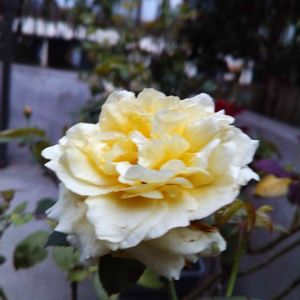 四季咲き大輪バラ チャイコフスキーさん咲きました🟡 今朝は雨が降りそうですが、秋バラが始まったかと⁉️ まだ夏バラの名残なのか、涼しくなって色が濃いです💛