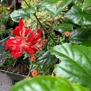 2軒隣のお宅の一重のハイビスカスと、我が家の花たち この夏から秋にかけ、ハイビスカスに元気もらいました 一重のハイビスカスは、夏と秋では色合いが違うのね‼️