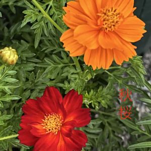 園芸店お勧めの花コスモスの新人さんです🌸 真っ赤な花とオレンジの長持ち八重咲きの花達 ※今日から秋桜、仙人草、男郎花、竜胆、酔芙蓉、松虫草、野菊を秋の七花とします (ひみつのアッコとラスカルさんの選花です)