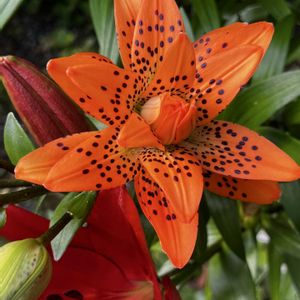 八重咲きの透かし百合、黒い粒のオレンジの花 玄関前で、赤い一重の透かし百合と咲いてます