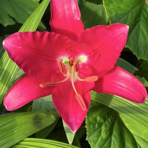 鮮やかなお目覚めの花オリエンタルリリーです 玄関前や鉢植えの百合が梅雨の合間に開花です
