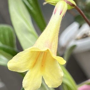 クリーム色のストレプトカーパスに似た花です 新宅の玄関で開花し、雨で居間に避難しました イワタバコ科のプリムリナアイコの花と教えて くれたtottokoさんありがとうございました❗