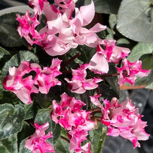 ベランダのシクラメンたちが満開になりました ピンクの縁取りの可愛い花と,真っ赤な花二鉢 赤いアフロディーテは銀の葉が美しいです🩶