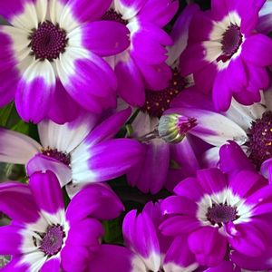 お花屋さんの店内に、色彩豊かなサイネリア 3月の卒業式に鉢植えの花が飾られたりします