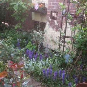 今朝のお庭です。アジュガが満開。タツナミソウも咲き始めています。背景はモルタル造形です。手前はバラです♡