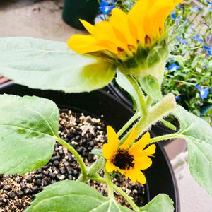 我が家のミニひまわりちゃん、後ろからひょっこり🌻 とってもかわいいです☺️💕