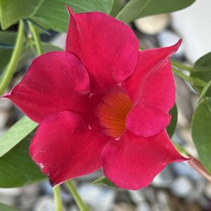 Mandevilla sanderi/Mandevilla. Apocynaceae. Gentianales. Magnoliopsida. Tracheophyta Commonly called/Brazilian jasmine. Dipladenia sanderi Native to/South America(the state of Rio de Janeiro in Brazil) Symbolism/Strength. Resilience. Adaptability *The plants ability to thrive and produce vibrant blooms *Genus of about 120 species *The plant/6-8 feet(180~240cm)tall and 2 feet(60cm)wide *The flower/2-3inches(5-7.5cm)in diameter *A British diplomat and gardener, Henry Mandeville, introduced Chilean Jasmine to cutivation. Photographed 8/3 9:02am. 2025 posted 8/4(Monday) 11:28am 2025