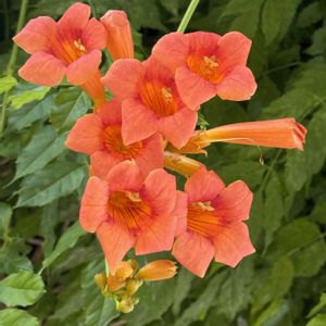 Campsis radicans/Campsis. Bignoiaceae. Lamiales. Magnoliopsida. Tracheopyta Commonly called/Trumpet vine. Trumpet creeper Native to/the central and eastern United States Symbolism/A fresh start. Resilience. Determination *Genus of 2 species *Vigorous climber with ovate, pinnate, dark green leaves, 1-4in(2.5-10cm)long Orange to red flowers, 30ft(10cm), from Summer to Autumn. *The genus name comes from the Greek word ‘kampe’ meaning “bent” in reference to the bent stames of flowers. *John Bartram,an early American botanist, had his journey by sending seeds and plants to England, around the early 17th century(with John Parkinson). Photographed 8/5 8:43am 2025 Posted 8/8(Friday) 11:38am 2025