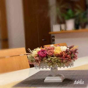 お誕生日に コンポート皿を プレゼントでいただきました 素敵な器なのでプリザーブドフラワーを たくさん使って秋バラとちょこっと ハロウィンの要素も入れてアレンジ してみました💕