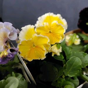 【パンジーの寄せ植え】 先週… 黄色と水色のニュアンスカラーの『シエルブリエ』に一目惚れし… (また?🤭) おい『シエルブリエ』💛🩵 『ローブドゥアントワネット クレールドゥリュンヌ』 と 水色の美しい 『シエルブリエ』 の寄せ植えに植え付けました😆 中々開花しないこぼれだね 『アゲラタム』を抜きました…🤣 (もう一歩…どっちにしろ、もう寒いのですぐ抜くことになりますがね…別な鉢に移しました☺️) ようやく寄せ植え完成かな?? ですが… ここに剪定した 『キンギョソウ トゥイニー』がいるんです… 咲いたらバランス悪くなるかな… そしたら移動します… (やはりまだまだ未完成…💦) 今のところメルヘンチックなぶりぶりの寄せ植えになっています👼✨✨ (5枚投稿)