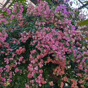 植物園の温室内 見上げる🌸ブーゲンビリア(オシロイバナ科)の色とりどりの花🌺花🌸 花期10~4月とか。春からの花と勘違いしてました〜 何度も来てますが 今までの中で1番の花付き💓に圧倒されます 我が家の🤍🌿斑入り葉ブーゲンビリアは葉を落とし〜情けな~い姿🤣でミニ温室の中に 復活に期待です❣️