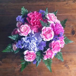 新車納車でいただいたお花 上が正面から、下が後ろからのpic ガーベラ、カーネーション、スイートピー 可愛い感じのアレンジです🎶
