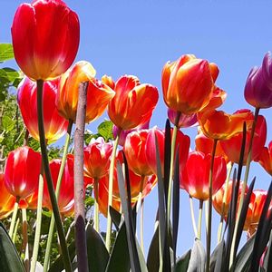 小学校脇、ボランティアさん達が 育ててるお花 風は強いけど快晴です チューリップが揺れて 気持ちよさそう❤🎵