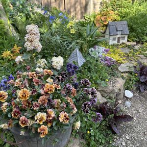 annacoco garden.。.:*♡ 夏に向かってビオラからメンバーチェンジした💕 ずっと眠っていたスカビオサから蕾がたくさん出てきて遂に咲き始めました💜 夕方なのでとんがり屋根のお家に明かりが灯りましたね〜(ღ*ˇ ˇ*)。o♡