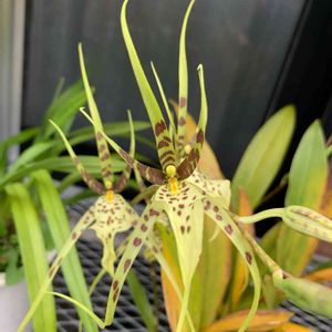 スパイダーオーキッド🕷ブラッシアの開花😄 雨が少し止んだので、ベランダに出たら咲いてました😅 同じ向きに咲かせたい為、雨でも移動はして居ません😊 大株で、花芽は4本有ります。 もう少し咲いたら室内に飾る予定😊