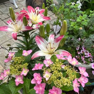 紫陽花2番手は 💗春よ恋💗 (山アジサイ✖️西洋紫陽花?) 上の花は💗百合ロリポップ💗かな?