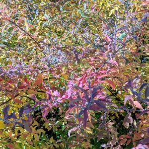 リハビリついでの 花散歩で✨ 🩷💜🩵💚💛💚🤍💖🌑🌹 ♪ 1️⃣虹色に紅葉🌈 雪柳 光のいたずら🤩 2️⃣小海老草 3️⃣山茶花 先週投稿の蕾が満開 4️⃣青葛藤 青い実が黒くなっていました 5️⃣薔薇 今日も 笑顔😄で 過ごせますように💐
