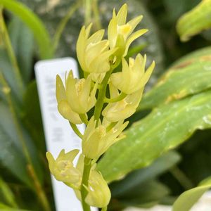 【大筬蘭】《ラン科》 山地の石灰岩の多い山の岩上や樹幹に着生する草丈25~35cmの多年草。 根茎は匍ふくし偽球茎をつける。 茎は楕円体、少し扁平で基部に鱗片がある。 葉は2~3個、茎の先端部につき、倒卵状披針形、長さ20~30㎝でやや薄い緑色。 花は花茎の上部に5~30個付き、淡黄緑色~白色で長さ10~13mm。唇弁は舌状で反曲、3裂し、基部に5本の隆起線がある。 室果は長楕円形で長さ1.1~1.5cm。 分布は屋久島以南、沖縄県は本島北部と石垣島。開花期は9~10月。 2021.9.29