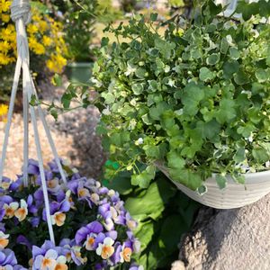 おはようございます🌞 モチノキにハンキングのシンバラリア「スノーリップル」とビオラです❣️ スノーリップルは3/1に処分品で小さな苗を迎えて、地植えにしたけど、全く大きくならずに弱ってきたのでハンキング鉢に鉢上げしたら元気モリモリになりました👍 斑入りの葉っぱが新芽は🌱所々、斑がなくなってグリーン😆😆 斑入りが無くなるのかな⁇