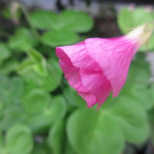 挿し芽したオキザリス・ボーウィ(ハナカタバミ)が夏の間休眠してましたが、葉も急成長して、大きなピンクの花が咲き始めました。