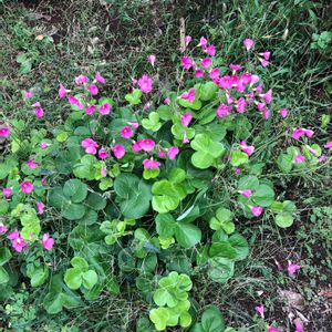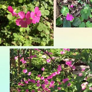庭に咲いているカタバミ3種 (1) 少し大きなピンクの花は オキザリス・ボーウィー🌸 (2)ピンク色の小さな花は ムラサキカタバミ💕 (3)紫色ハートの葉っぱが可愛い オキザリス・トリアングラリス💜
