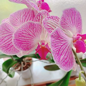 おはようございます☔️ 今朝は雨に水やりをおまかせできますね😚 で、室内のランを撮りました🤳 ①以前モニターでいただいた、ミディ胡蝶蘭キャンディちゃん🩷 今年のつぼみは11個♪ 今4輪咲いてます。 やっぱりすじすじのお花が可愛い🥰 ②去年友人にもらった蘭の寄せ植えに入っていたミニ胡蝶蘭。 解体しておひとり様にして、また咲いてくれました👍 ③5〜6年前にいただいたデンドロビウム(もらいものばかり🤣) 鉢がパンパンになってから2年たち、さすがに放っておけず、去年自己流で株分けしました。 下手な大手術✂️💦だったからダメかも…と思っていたけど、ちゃんと咲いてくれましたよぉ😭👏🏻💕 こちらはプラ鉢➕蘭の土を使用。 ④分けた小さい方の株。 こちらは素焼き鉢➕水苔。どちらの植え込み資材がいいか観察してみます🙋♀️
