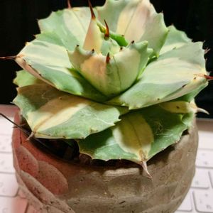アガベ王妃雷神錦 信楽焼の丸鉢で楽しみます お正月の葉牡丹みたいです(*´∀`*)