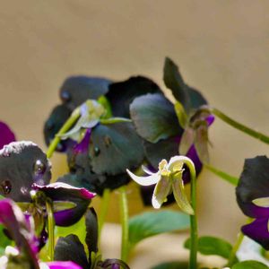 深紫黒というのでしょうか 光線の角度で 真黒だったり紫だったり …苗業者さんは 高温多湿に弱いビオラの若苗を高地高原に疎開させると聞きました。そこそこ雨や霧が出る土地では 、ほぼ放牧だそうです。…それで この花映え お値段 は 安過ぎて申し訳ない気持ちです