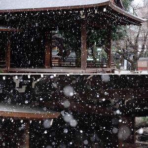 五年前の二月です。 零戦を見たくて靖国神社に行きました。 桜はまだで、雪が降りました。 能舞台にも雪が吹き込みます。