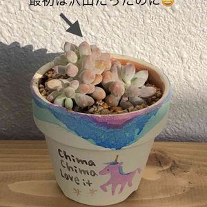 我が家の多肉事情😰 色づいて来たけど…ハゲてく💦💦 赤ちゃんのおててがバラバラ取れる(怖) 初めての可愛い作家鉢💕絵柄を見せようとこの向きにするとハゲが丸見え(笑)
