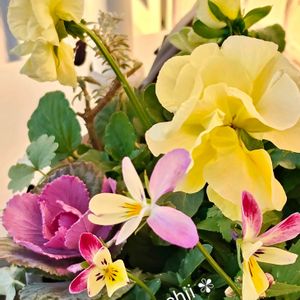 虹色の寄せ植え🌈 ・パンジー ルナ・ドゥーブル💛 ・ビオラ バニーイヤーズ ピンクイヤーイエローフェイス🩷💛 ・ネメシア アレンジ ラベンダー💟 ・ハボタン ローズブーケ ピュア💗 ・プリンセスクローバー ダークデビー♣ ・ヘリクリサム ペティオラレ🌿 ・斑入りグレコマ🌿 ・ウエストリンギア スモーキーホワイト🌿 ①月🌙にウサギ🐰を合わせました🤭💓 ②バニービオラも蕾増えてきましたよ💕 ③単色のネメシアはお初です🔰 ④寄せ植え全体像 ネメシアが折れてしまい😱 真ん中らへんのお花がない💦 撮影が16時前になってしまい 日差しは夕焼けっぽい色に🌄 ⑤⬇️22日のお昼前のpic 虹の橋🌈の向こうでも みんなぬくぬくで寝るんだよ😴 🏷パステル気分♡ 🏷虹の日 🏷ビオラ・パンジー祭り♪ 🏷月曜日を爽やかに 🏷月曜日にビタミンカラー 🏷秘密の花園♡ 🏷花咲く乙女たち♡ 🏷スライドショー♪ 参加させて下さい🌈( ꈍᴗꈍ)