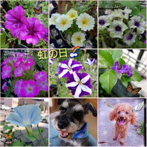 🏷虹の日 🍀庭の花 🤍アサガオスプリットペダル 🤍白花コスモス 🩷薄ピンクのコスモス もじや工房さんに三兄弟🐶🐶🐶の絵を描いて頂きました。