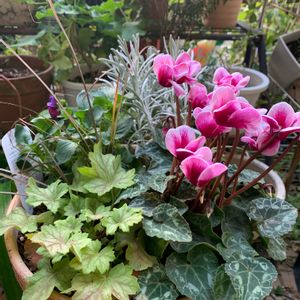 ガーデンシクラメンとヒューケラ 向こう側にはミルフルあとはリーフの寄せ植えも見てくださ(*˘︶˘*).。.:*♡ やっ先々週ポット苗から 植えました😅🌱🌸 今度こそ行ってきま〜す♥️