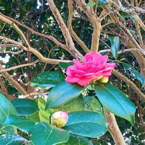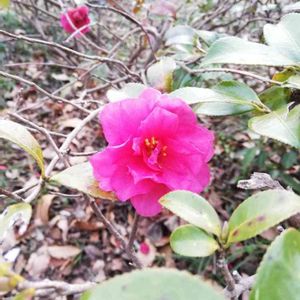 これは、カンツバキ(寒椿)ということです。 私のはかない知識だとサザンカに見えますが、看板に「カンツバキ」と明記されていましたので、そうなんだろうと思います😓 サザンカとツバキの交雑種らしく、葉の鋭いギザギザや散る時に花弁がばらばらに落ちるなど、サザンカの性質が強いようです😃