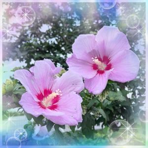今日のお花〜ムクゲ ①弟宅の地植え🩷 ②我が家の鉢植え🤍 ③職場にて挿し木〜地植え💜