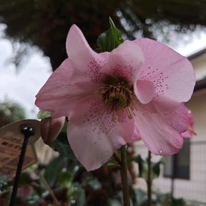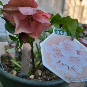 おはようございます クリスマスローズ 散らず桜 開きかけ💕 俯いてて写真が撮りにくい💦 🏷に支えてもらいました☺️ 備忘録 剪定 ミニバラ モカ、愛美