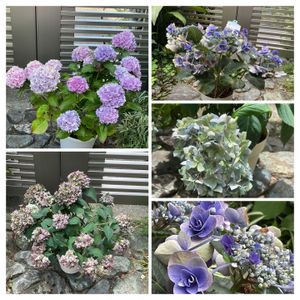 大好きなアジサイも真夏日に色あせ そろそろお別れですね 1枚目は今年お迎えした3種、それぞれ素敵で一目惚れでした 2枚目は剪定したお花、捨てがたくて花遊び