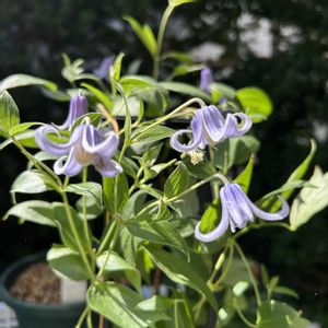 クレマチス 水面の妖精🧚 一目惚れでした、実物を見るのは初めてです モンタナ スノーフレークが枯れてしまったと娘がガッカリしていたので買いに行ったのに素敵なクレマチスにも出会えました☺️ クレマチス好きの娘への誕生日プレゼントです🎁 早速娘の庭で🤳ブルーのお花とコラボ写真🤳