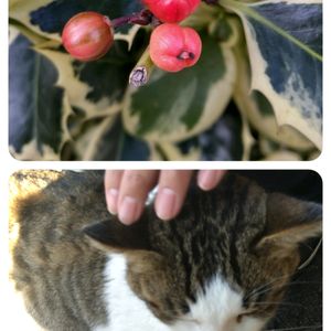 おはようございます✨ 玄関の斑入り西洋ヒイラギの実、やっと赤くなってきました。 いつもクリスマスには間に合わない😅💦 🏷️日曜ビタミンカラー♪ 先日の秋月パン屋の猫で 🏷️ニャンニャン祭り 参加しますね☺️