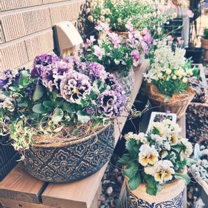 寄せ植えした時は花数少なく、寂しかったけれど、気づいたら満開でした💙サトウ園芸さんのパンジー 素敵です✨✨