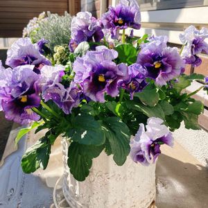 *月のひかりを イメージして 生まれた ❦ フリルパンジー❦ ローブ・ドゥ・アントワネットから生まれた品種✨ 春🌸遅くまで楽しめそう〰(^^♪ *ラナンキュラス♡切り花も 楽しんでます♥ 🏷美しく青きドヨウ 🏷コラージュ仲間たち 参加させて頂きます〜💜💙🧡( ꈍᴗꈍ)✿