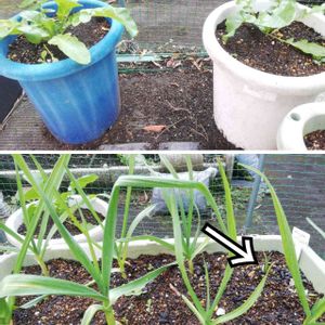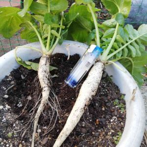 鉢植えの大根 3ヶ月以上経っているのに ちっとも大きくならない😨 にんにくも 他は順調だが 矢印は 枯れているのかも…