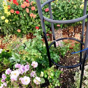 バラのポンポネッラさんが右へ左へびょんびょん伸びてきました。ようやくオベリスクに絡ませられる…?